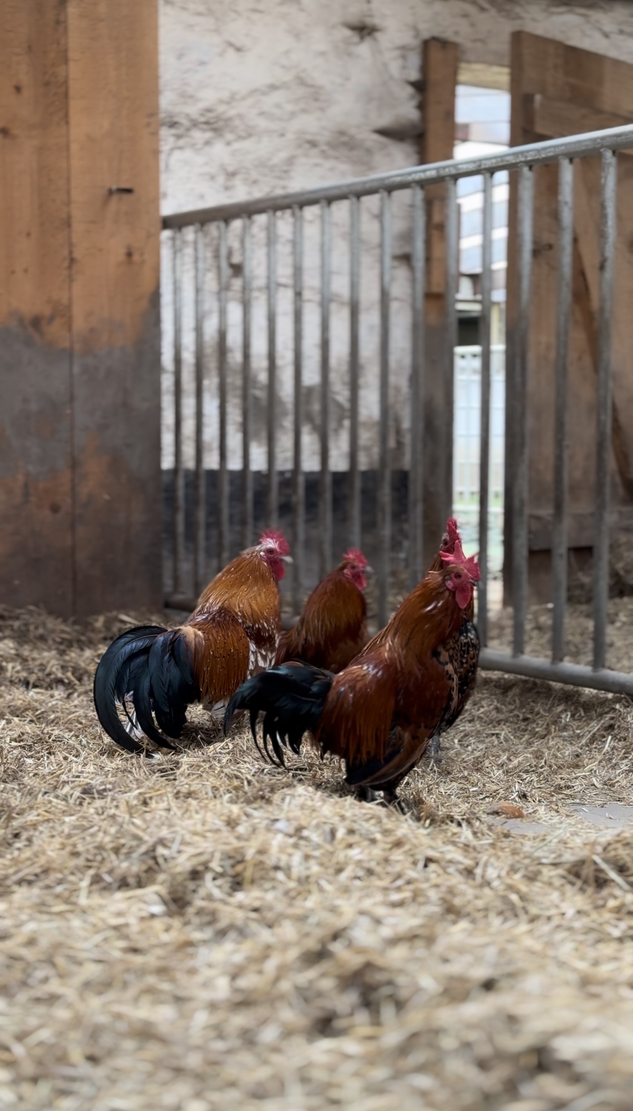 Unsere Boy Group heißt so, da sie alle zusammen im Jahr 2023 zu uns kamen und immer in einer großen Gruppe bleiben. Die Hähne wohnen und leben mit den Schweinen zusammen. Die Türe nach draußen stehen tagsüber immer offen, jedoch sehen wir sie nur selten mal den Schweinestall verlassen. Und wenn, dann natürlich alle zusammen. Sie sind die engsten Freunde und sie verstehen sich. Es gibt nie Streit oder gezankte. Auch nicht, wenn es ums Essen geht. Sie haben sich einfach alle miteinander lieb.
