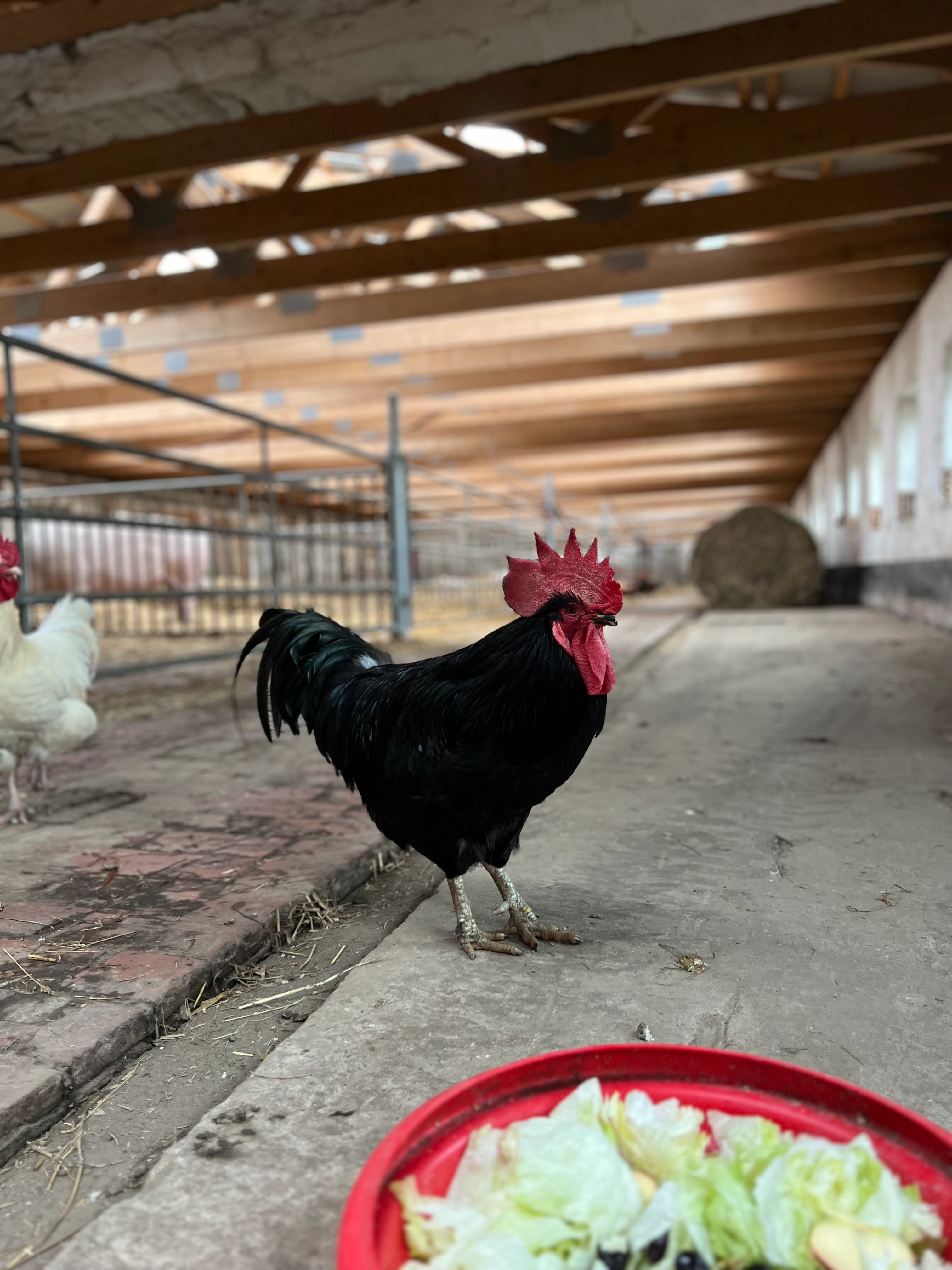 Tabaluga ist im Juni 2023 bei uns auf dem Hof geschlüpft. Seine Mama hatte ihre Eier so gut versteckt, dass wir sie nicht finden konnten. Bis zum Moment, wo er geschlüpft ist, haben wir nichts davon gewusst. Eines Morgens hörten wir es aus einem großen Heusack plötzlich piepen. Tabaluga wuchs anfangs langsam, er war schüchtern, da seine Mama ein sehr schreckhaftes Huhn ist. Mit der Zeit gewöhnte er sich jedoch an uns. Wir haben ihn jeden Morgen mit Müsli aus der Hand gefüttert und er fühlte sich wohl. Als er jedoch größer wurde und ins Teenager-Alter kam, änderten sich seine Interessen. Das Hand-Fütterungsritual war langweilig. Die weiblichen Hühner dafür aber immer interesannter. Er fing an seine ersten "Kikuruku"-Laute zu rufen, was einiges an Übung und Zeit kostete, bis er es flüssig und geschmeidig drauf hatte.