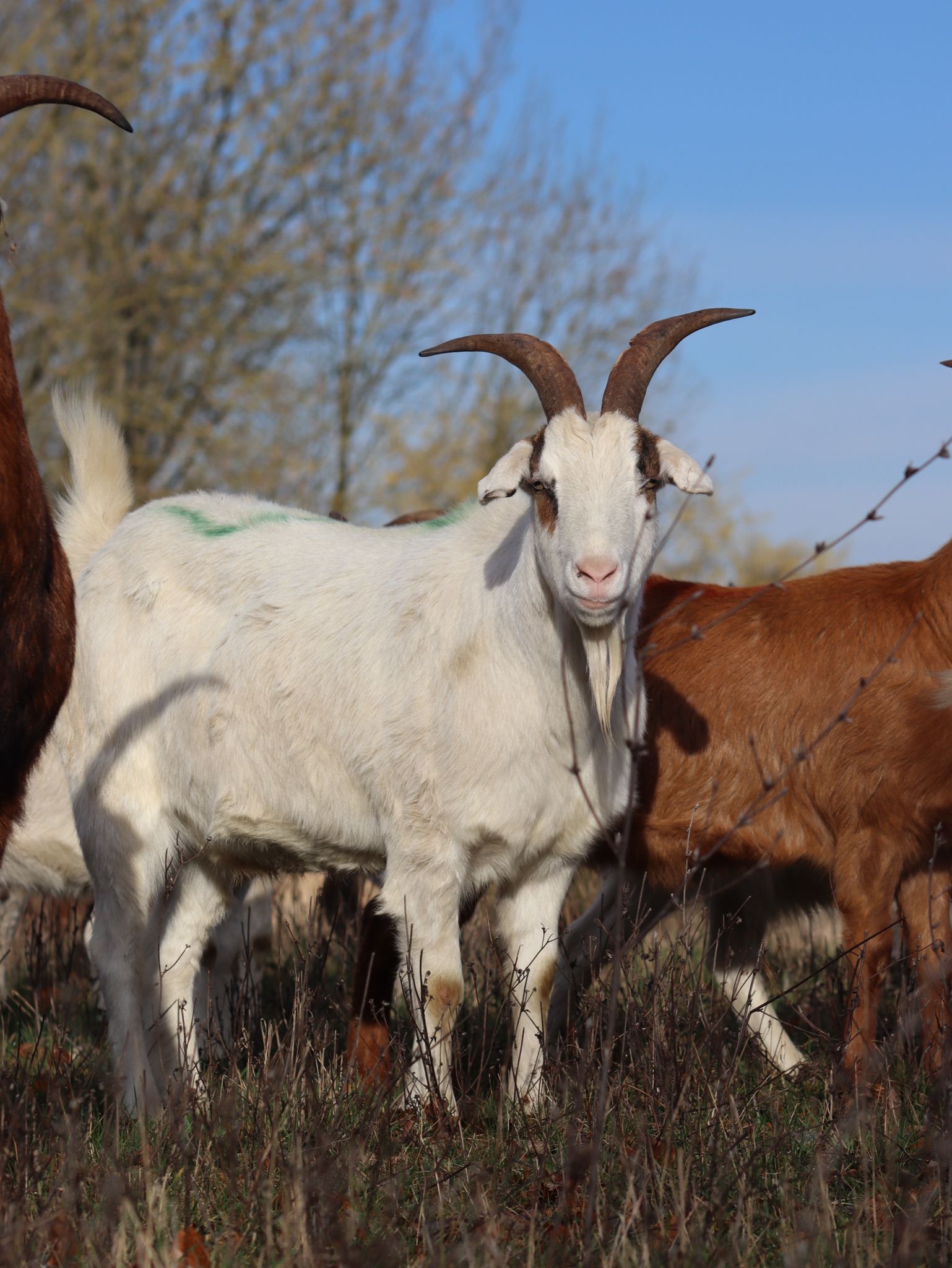 Die meisten unserer Ziegen konnten wir von einer schließenden Schäferei übernehmen. Sie sind neugierig, intelligent und laufen super in der Herde mit. Sie lieben es in den Bäumen zu klettern.