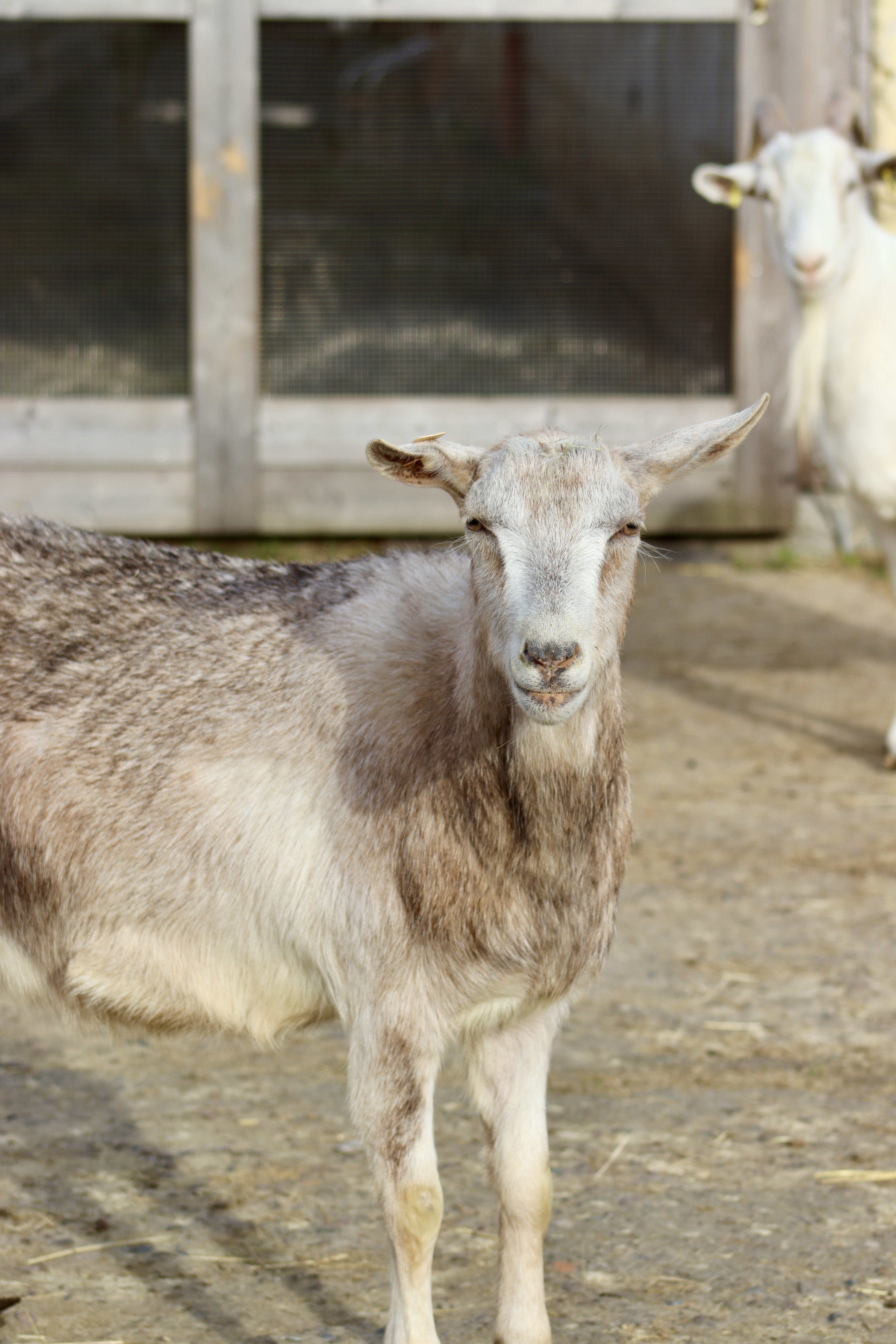 Elwing kam im Mai 2022 mit gerade mal 2 Tagen zu uns. Ein Schäfer kontaktierte uns, da bei einer seiner Ziegen eine Drillingsgeburt gab. Schafe und Ziegen können aufgrund ihrer zwei Zitzen nur zwei Lämmer/Zicklein gleichzeitig aufziehen. So kam Elwing zu uns und wurde ein Flaschen-Zicklein. Sie wuchs mit in der Wohnung auf, nutze sogar ab und an die Katzentoilette, da sie sich das bei den Kitten abgeguckt hatte. Sie kam überall mit hin. Zum Zäune bauen, zum Einkaufen und abends dann halt mit aufs Sofa. Mit circa einem Jahr entwickelte sich bei Elwing eine Stoffwechselstörung. Die Ärzte können nicht sicher sagen, wie diese ausgelöst wurde. Die Folge dieser Stoffwechselstörung hat sich bei ihr auf das Sehvermögen ausgewirkt. Elwing ist blind und wohnt mit ihren blinden Freunden gemeinsam auf dem Hof bei uns. Trotz ihrer Blindheit ist sie noch immer eine Ziege und wild am Klettern. Man findet sie auf dem Heuballen, auf einem hohen Stein oder mitten in der Heuraufe am Schlafen.